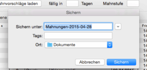 Nun öffnet sich erneut ein Fenster. Das System schlägt einen Ort für die Speicherung der Gesamtdatei vor (eine PDF-Datei mit allen Mahnungen). Bestätigen sie mit ’sichern‘ oder passen sie den Vorschlag an.