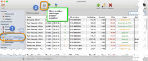 Öffnen sie dann Belege und wählen Rechnungen (Nr. 1). Sie sehen nun die Tabelle mit den Rechnungen. Wählen sie unter Aktion ‚ Mahnungen erstellen‘ (Nr. 2).