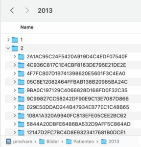 Beispiel für ein Server-Verzeichnis für Bilder und Belege unter macOS (/Volumes/pmshare/Bilder/Patienten/) mit den Unterordnern (Jahr/Monat/Patientenordner):