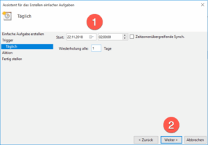 Belassen Sie die Auswahl auf „Täglich“. Klicken Sie abschließend auf „weiter“ (2).