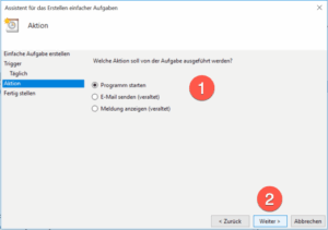 Belassen Sie die Auswahl auf „Programm starten“. Klicken Sie abschließend auf „weiter“ (2).
