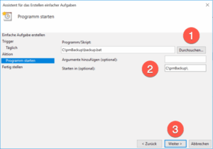 Wählen Sie über Durchsuchen (1) das Script „backup.bat“. Geben Sie bei „Starten in“ (2) das gleiche Verzeichnis an in dem sich „backup.bat“ befindet. Klicken Sie abschließend auf „weiter“ (3).