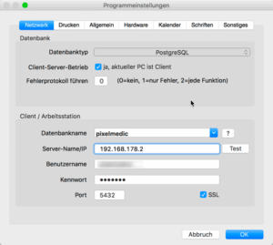Falls sich die IP des Servers über VPN nicht abbilden lässt, müssen Sie die IP im Feld „Server-Name/IP“ in::pixelmedic entsprechend ändern. Alle anderen Felder (Benutzername, Kennwort, Port und SSL) sollten Sie aus der Praxis übernehmen.