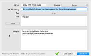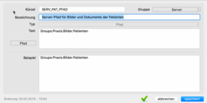In den Systemstammdaten (System→Systemkürzel) finden Sie unter dem Kürzel „SERV_PAT_PFAD“ im u.g. Beispiel „Groups:Praxis:Bilder:Patienten“. In diesem Fall muss über VPN der Gruppenordner „Praxis“ für den aktuellen Anwender sichtbar sein. Dies bedeutet in diesem Fall, dass der aktuelle Anwender Mitglied der Gruppe „Praxis“ ist und korrekt am macOS-Server angemeldet ist. Bei Verwendung einer NAS ist analog vorzugehen.