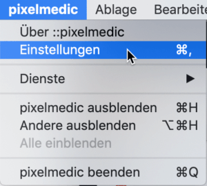 In der Menüzeile wählen Sie unter macOS pixelmedic->Einstellungen bzw. unter Windows Hilfe->Einstellungen