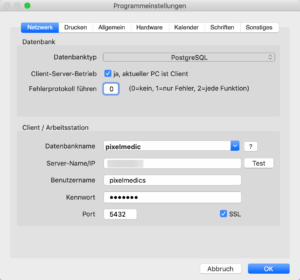 Im nachfolgenden Dialog wählen Sie als Datenbanktyp „PostgreSQL“ und markieren Client-Server-Betrieb. Unter Client / Arbeitsstation tragen Sie die entsprechenden Daten ein. Beachten Sie bitte, dass Ihre Eingaben von dem u.g. Beispiel abweichen können. Falls ein SSL-Zertifikat auf dem Server eingerichtet und aktiviert (Standard) wurde, kreuzen Sie bitte SSL an. Abschließend bestätigen Sie den Dialog und Starten ::pixelmedic neu.