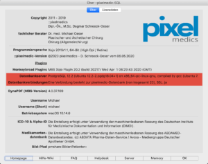 Um in ::pixelmedic Informationen über die Verbindung zum Datenbankserver zu erhalten, können Sie den Dialog „Über ::pixelmedic“ aufrufen. Diesen finden Sie über „Einstellungen“ s.o.