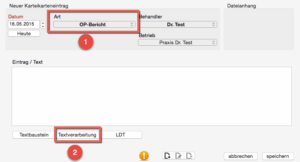 In der Karteikarte des gewünschten Patienten erstellen Sie einen neuen Eintrag mit der Art „OP-Bericht“ (1) und rufen dann die Textverarbeitung (2) auf: