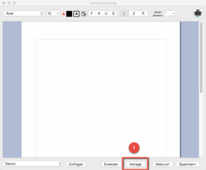 Es erscheint die – noch leere – Textverarbeitung. Drücken Sie dann Vorlage (1), damit Sie eine – bereits in den Stammdaten erstellte, s.o. – Vorlage einfügen können: