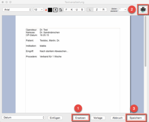 Um die Platzhalter bzw. Feldnamen durch die Daten des aktuellen Patienten zu ersetzten, klicken Sie auf Ersetzen (1):