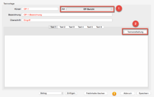 Nach Doppelklick auf den Menüeintrag Textvorlagen wird eine Tabelle mit bereits vorhandenen Textvorlagen angezeigt. Rufen Sie mit (oben in der Menüleiste) den Anlagedialog auf und wählen Sie als Art „OP-Bericht“ (1). Für Kürzel, Bezeichnung und Überschrift tragen Sie entsprechende Inhalte ein. Für die Erstellung bzw. Bearbeitung des eigentlichen OP-Berichtes bzw. des eigentlichen Textes muss die Textverarbeitung (2) benutzt werden: