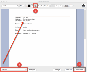 Anschließend erfassen Sie den gewünschten OP-Bericht bzw. Text. Sie können bereits vorhandene Texte z.B. aus Word(R) über die Zwischenablage übernehmen (z.B. über das Menü Bearbeiten->Einfügen oder das Einfügen-Symbol (3)). Sie haben auch Formatierungsfunktionen, um z.B. die Schrift oder Schriftgröße zu ändern. Fügen Sie Platzhalter und Feldnamen (1) an den Stellen ein, an denen Sie im echten OP-Bericht die Daten des Patienten platzieren möchten. Hierfür positionieren Sie den Cursor an die gewünschte Stelle und wählen aus der Liste der Platzhalter und Feldnamen (1) den gewünschten Eintrag. Der Platzhalter, im Beispiel unten ≪Datum≫, wird dann automatisch hinter der aktuellen Cursorposition eingefügt. Ungewünschte Platzhalter können Sie einfach mit den normalen Löschtasten entfernen. Speichern (2) Sie zum Schluss Ihre Eingaben.