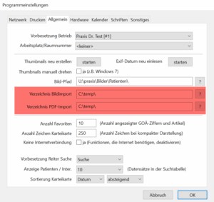 - In den Programmeinstellungen muss im Reiter „Allgemein“ müssen bei „Verzeichnis Bildimport“ und „Verzeichnis PDF-Import“ lokale Verzeichnisse gewählt werden. Netzwerklaufwerke können zu Fehlfunktionen führen.