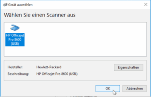 - Es erscheint ein Auswahldialog. Markieren Sie den gewünschten Scanner und klicken Sie auf „OK“
