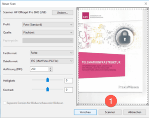 - Klicken Sie auf „Scannen“ (1), um das Scannen zu starten. Sollte jetzt eine Fehlermeldung erscheinen, das Programm einfrieren oder das Programm abrupt beendet werden, liegt in der Regel ein Problem mit dem WIA-Treiber vor (siehe Hinweise oben).