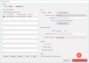 Wenn Sie mit dem Scannen für den aktuellen Patienten fertig sind, klicken Sie auf „Importieren & Beenden“ (5).