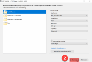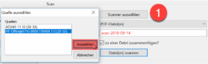 Dann gewünschten Scanner, durch Klick auf „Scanner auswählen“ (2), aus: