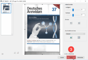 Anschließend erscheint ein herstellerspezifischer Dialog, mit dem Sie den eigentlichen Scanvorgang steuern. Als Beispiel sehen Sie einen Dialog von einem HP-Scanner. Da diese Dialoge vom Scannerhersteller erstellt werden, können die Dialoge von unserem Beispiel stark abweichen. Für weitere Informationen bezüglich des eigentlichen Scan-Vorgangs müssen Sie ggf. ins Handbuch des Scanners schauen.