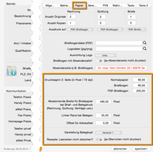 In der Maske wählen sie den Reiter ‚Papier‘. In der unteren Hälfte der Maske werden ihnen die Anpassungsmöglichkeiten angezeigt. Dies beginnt ab Druckbeginn 2. Seite. Beachten Sie, dass die Angaben in der Regel in Pixel und nicht nicht in Zentimeter sind. Falls Sie z.B. einen Briefbogen verwenden mit einem bedruckten Rand von ca. 4 cm, reduzieren Sie z.B. die abweichende Druckbreite auf 390 Pixel.