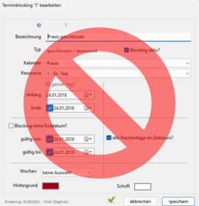 Die ::pixelmedics-Blockings (in der Software) werden vom OTK NICHT übernommen. Wenn Sie dennoch Blockings mit dem OTK aktivieren möchten, dann legen Sie im ::pixelmedics Terminkalender einen „leeren“ Termin an. D.h. ohne Patientenangabe, ohne Terminart, ohne Behandler, nur mit einem Titel (z.B. „Ferien“ oder „Kongress“ oder „Handwerker in Praxis“), mit einem Datum und der Zeitspanne.