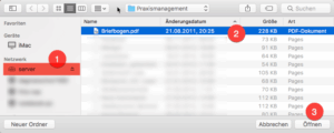 - Kopieren Sie die neue Briefbogendatei auf den Server in den gleichen Ordner wie zuvor (im Beispiel oben „Groups:Praxis:Praxismanagement“, siehe Vorbereitung, Schritt 2)