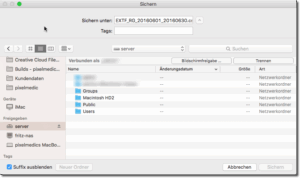 Nachfolgend sehen Sie den Suchdialog unter macOS, analog bei Windows-PCs. Wählen Sie im Netzwerk dann den Server oder die NAS (1) sowie den Ordner aus, auf bzw. in dem sich die Datei (so.o. Vorbereitung, Schritt 2) befindet. Markieren Sie die Datei (2). Dann klicken Sie auf „Öffnen“ (3). Zum Abschluss dürfen Sie in ::pixelmedic ‚Speichern‘ nicht vergessen, damit die Verknüpfung dauerhaft zur Verfügung steht.