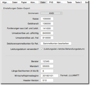 Es wird jeweils eine Datei im Format „EXTF“ als „Buchungsstapel“ erzeugt. Die Kontierung kann in den Betriebsstammdaten festgelegt werden. Für Rechnungen und Quittungen erfolgt eine Debitoren-Soll-Stellung. Die debitorische Verbuchung kann auf ein Sammelkonto oder auf einen Sammelkontokreis erfolgen: wahlweise 26 Konten für den Anfangsbuchstaben des Patientennachnamens oder 12 Konten für den Monat der Rechnungserstellung.