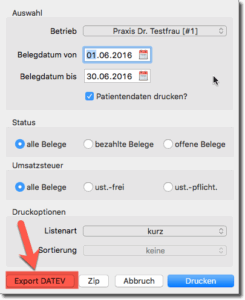 Die Möglichkeit die Daten in das DATEV-Format zu exportieren, finden Sie bei den entsprechenden Drucklisten: