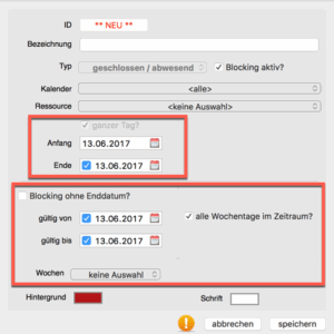 TYP derzeit sind nur Blockings möglich, die eine Ressource oder einen Kalender schließen; die Voreinstellung geschlossen, kann nicht geändert werden